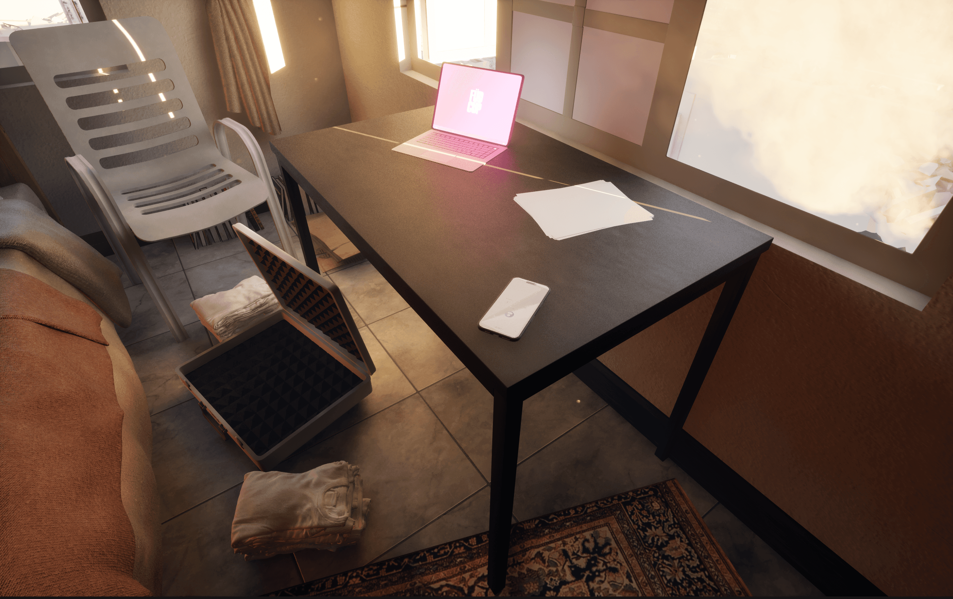 The main character starts off from the chair a bit tired and hazy but is probably getting clearer. They are silent at the beginning. The user has the choice to look around, but in case to prompt the user, the mobile starts ringing…..