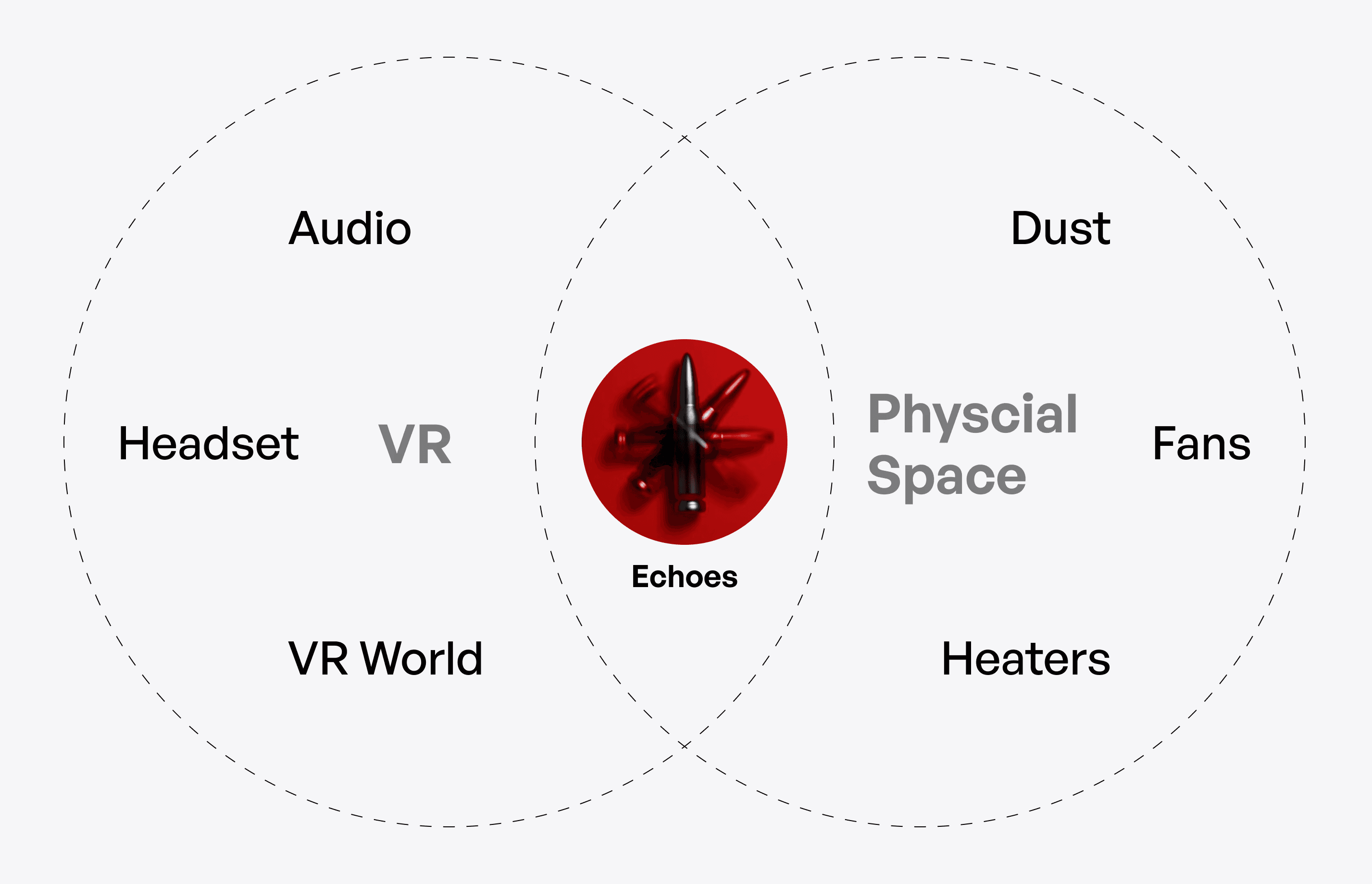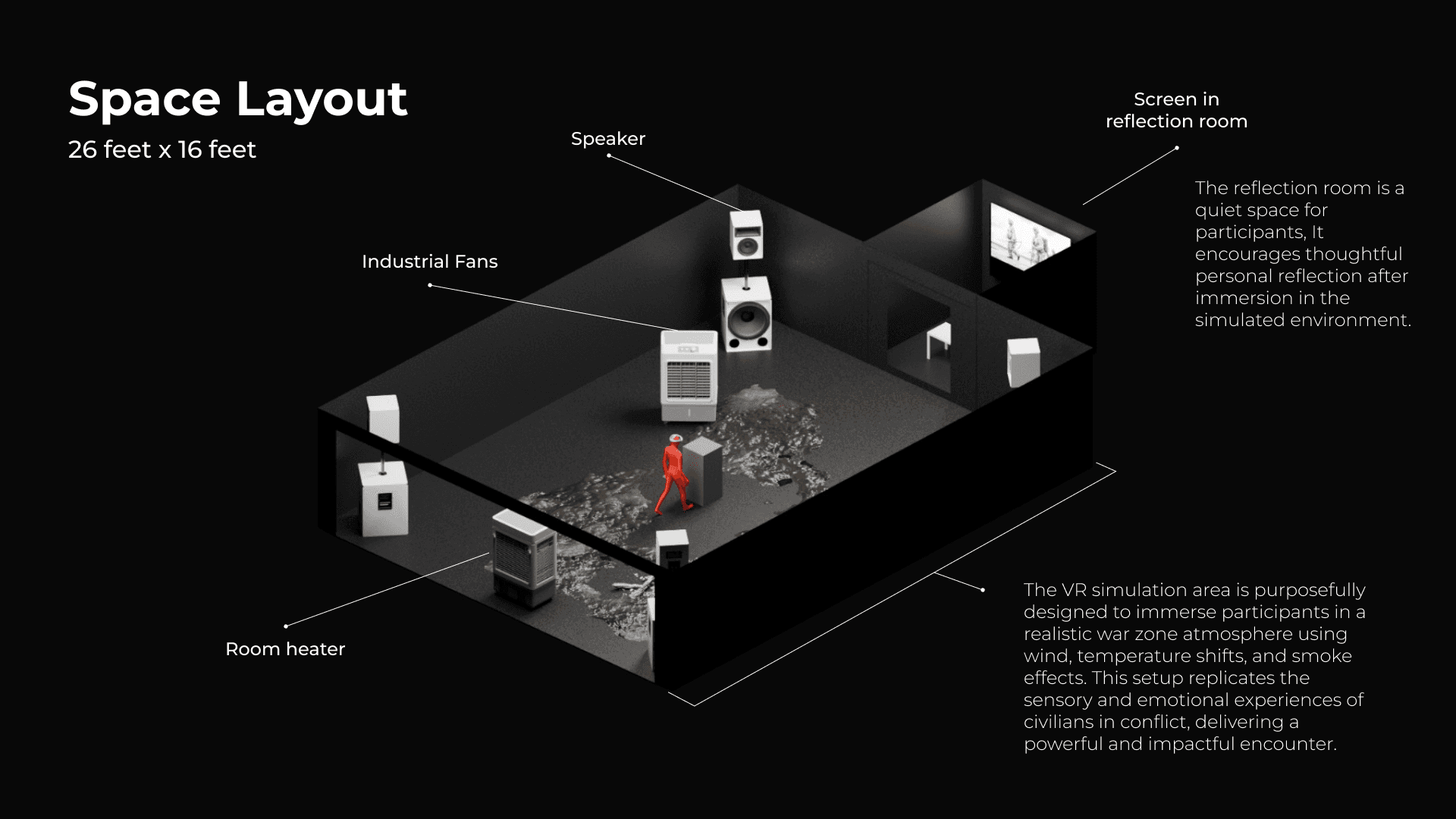 Another objective was to bridge VR and physical sensation by designing the space so users could feel real-world cues, such as airflow, heat, and physical barriers, to enhance barriers.