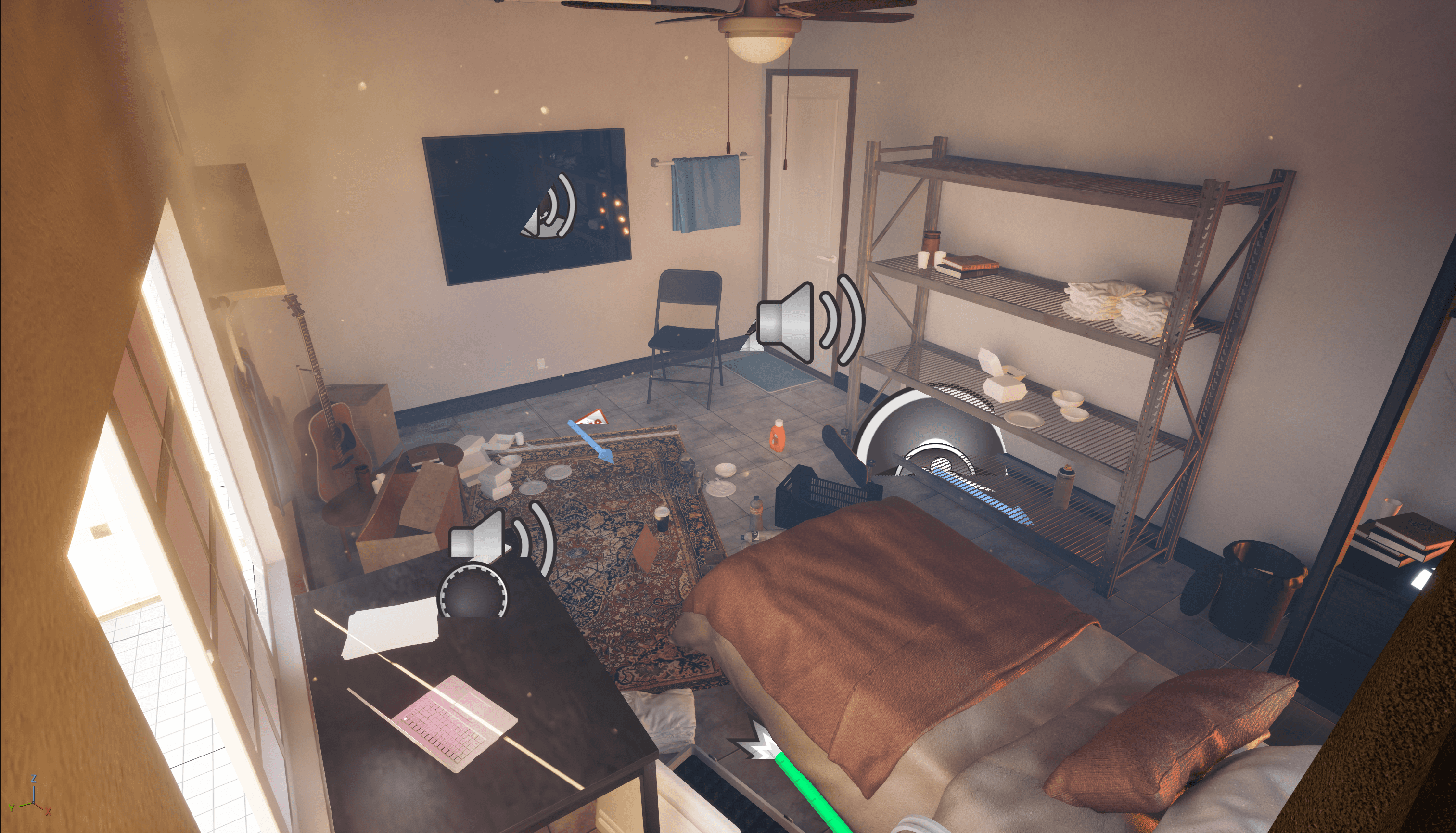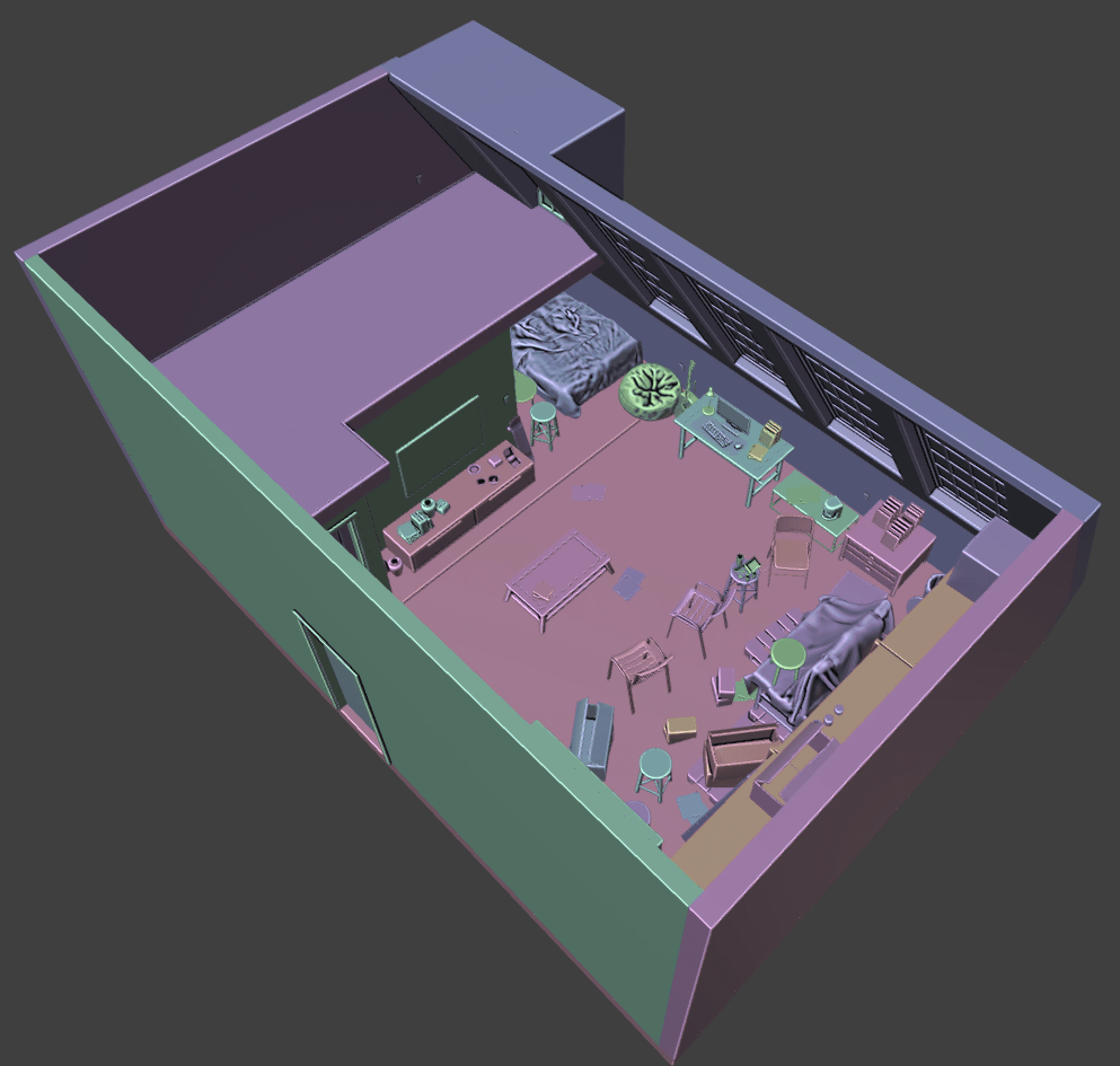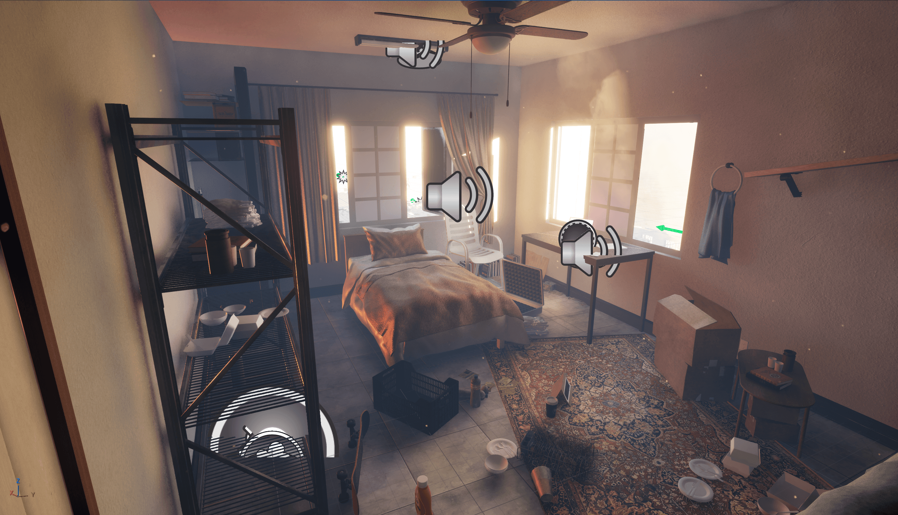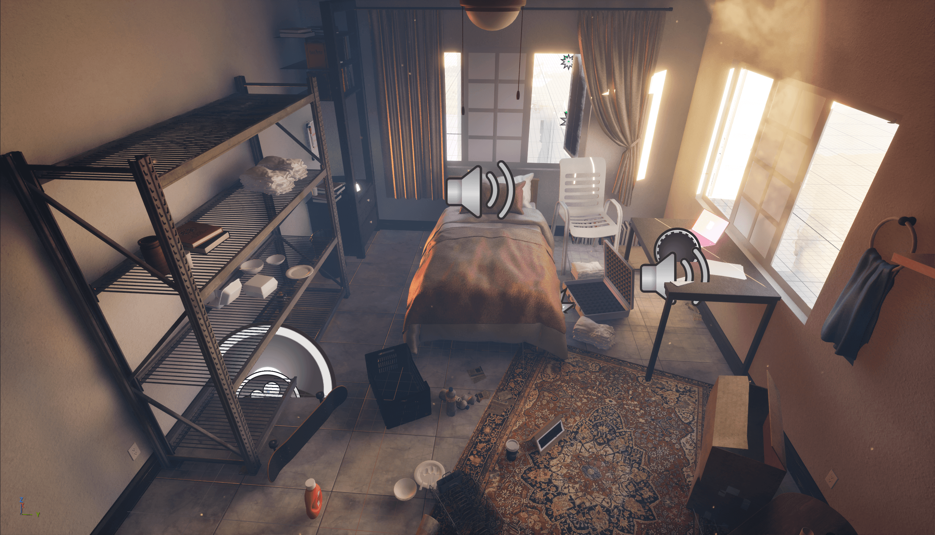 To fit this constraint, we decided to limit our virtual space to a single room flat meant for bachelors. we also wanted to include big enough windows for the users to look outside of. The decor and interior is very limited to essential items and a few
