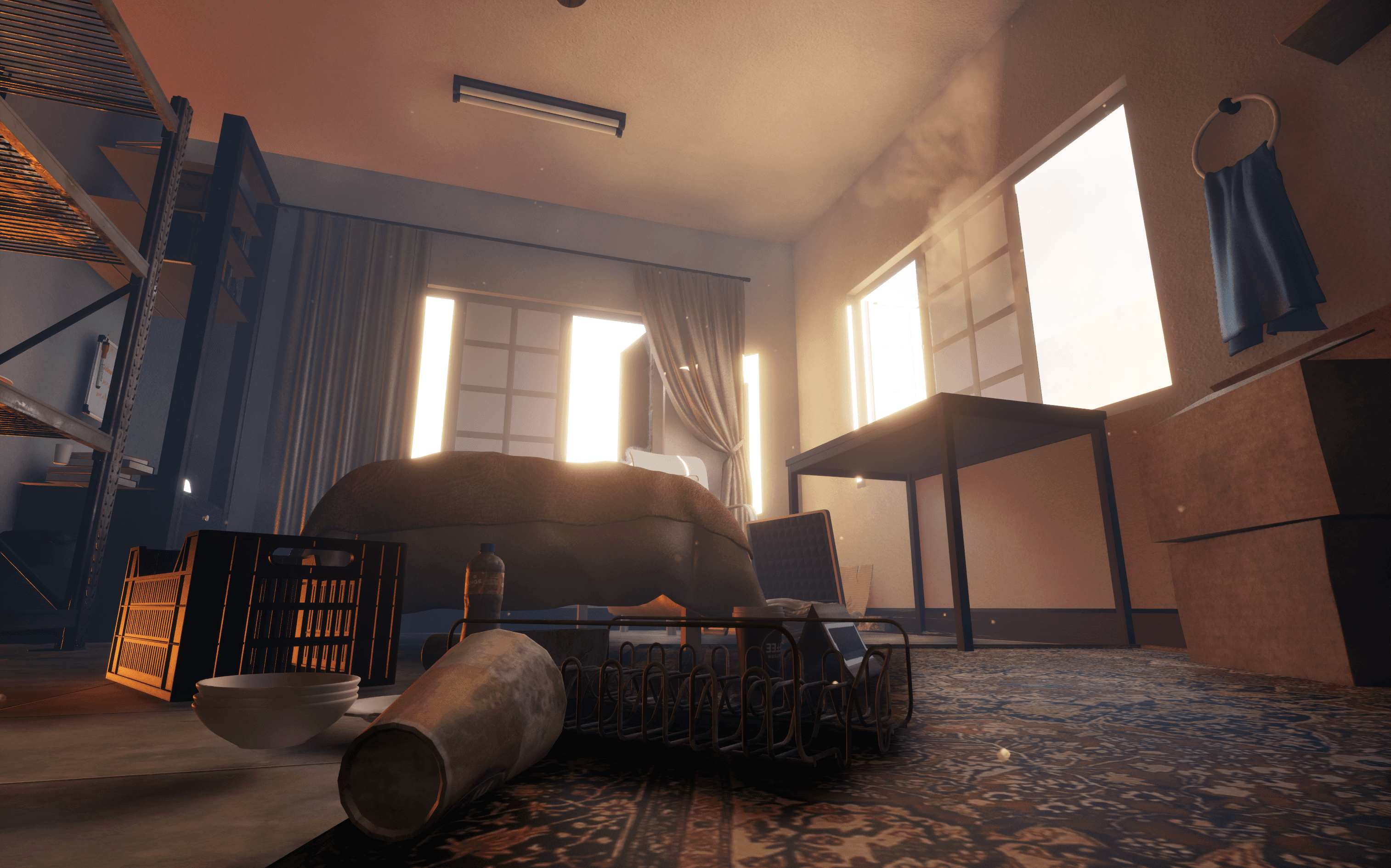 Scene: The character is sitting on a chair a bit tired and the vision is hazy but is getting clearer slowly and getting to know the space
