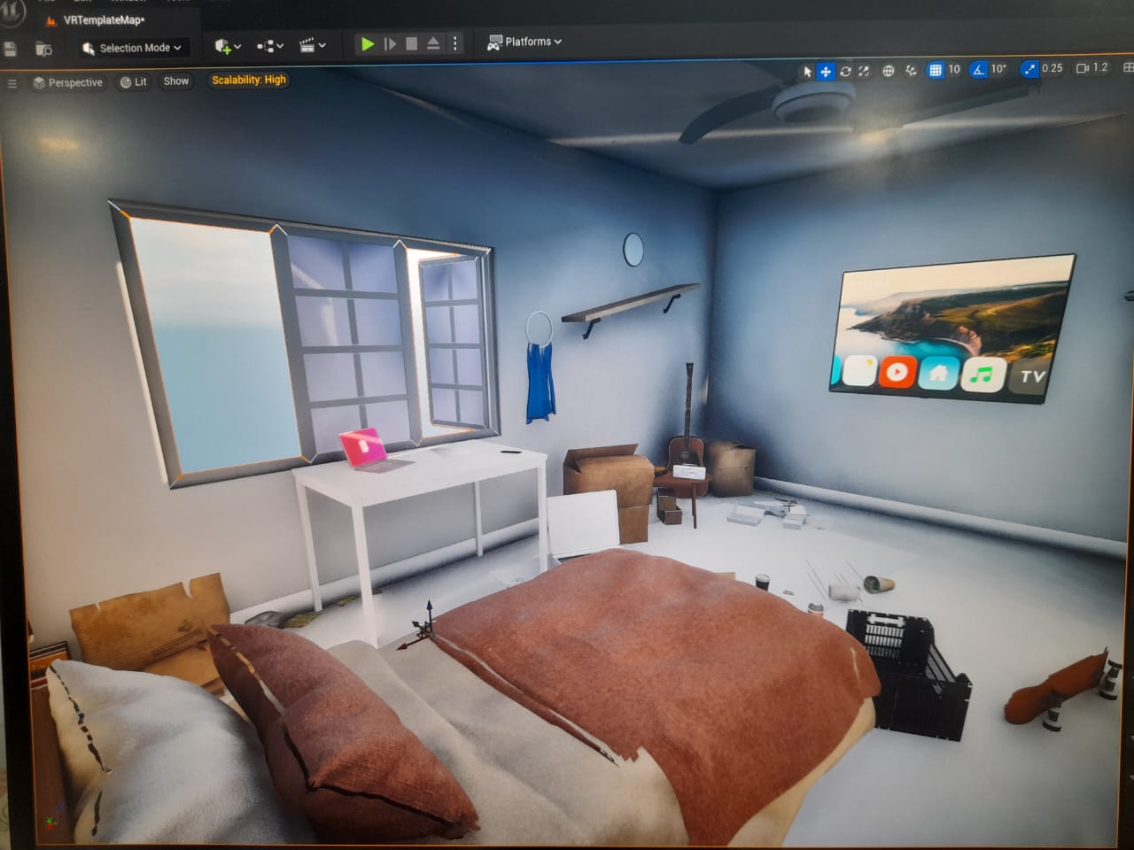 These are the images of the final VR Space. The way we were working was making the models nd textures in Blender and then exporting it in Unreal Engine. Then we set up all the remaining interaction Unreal Engine