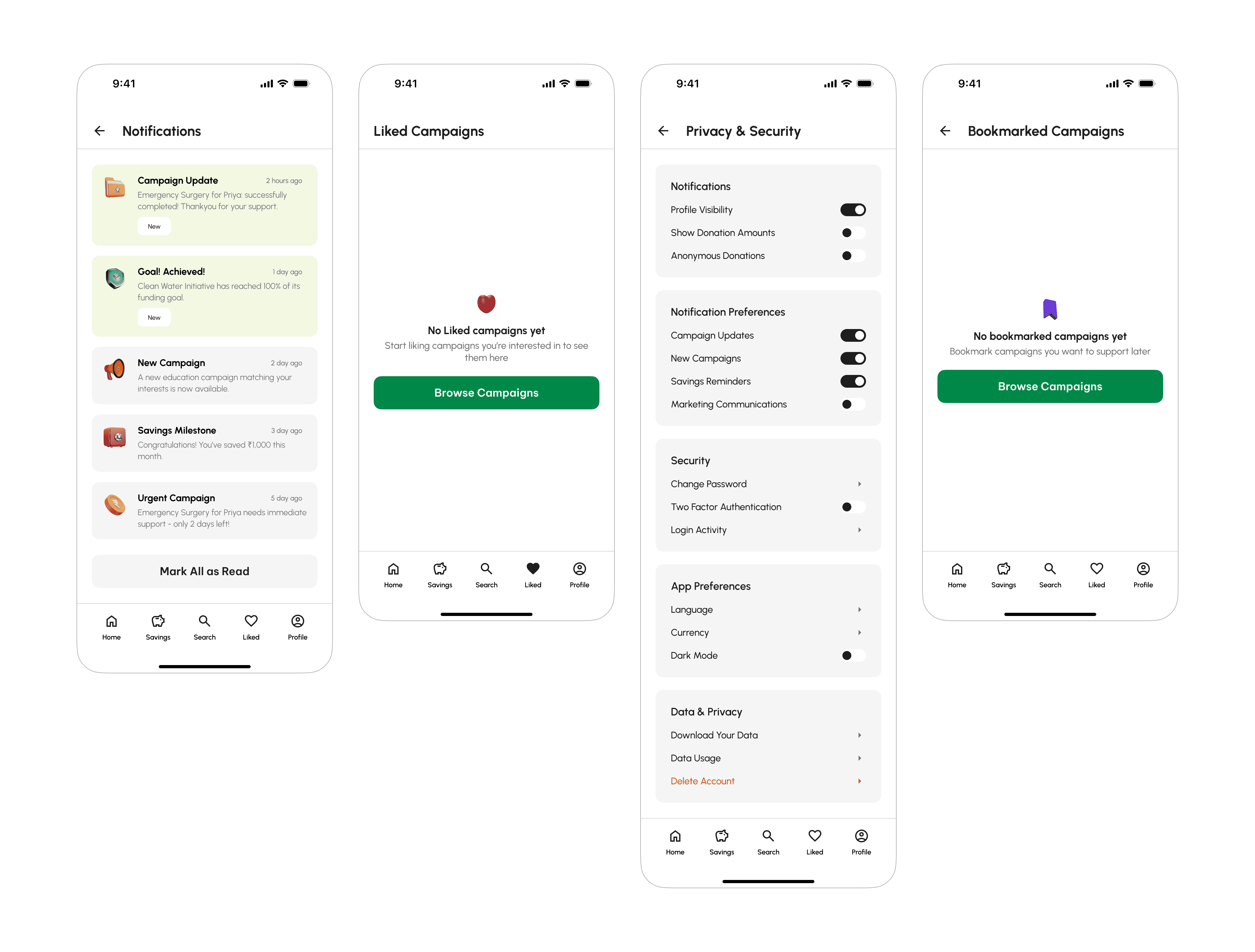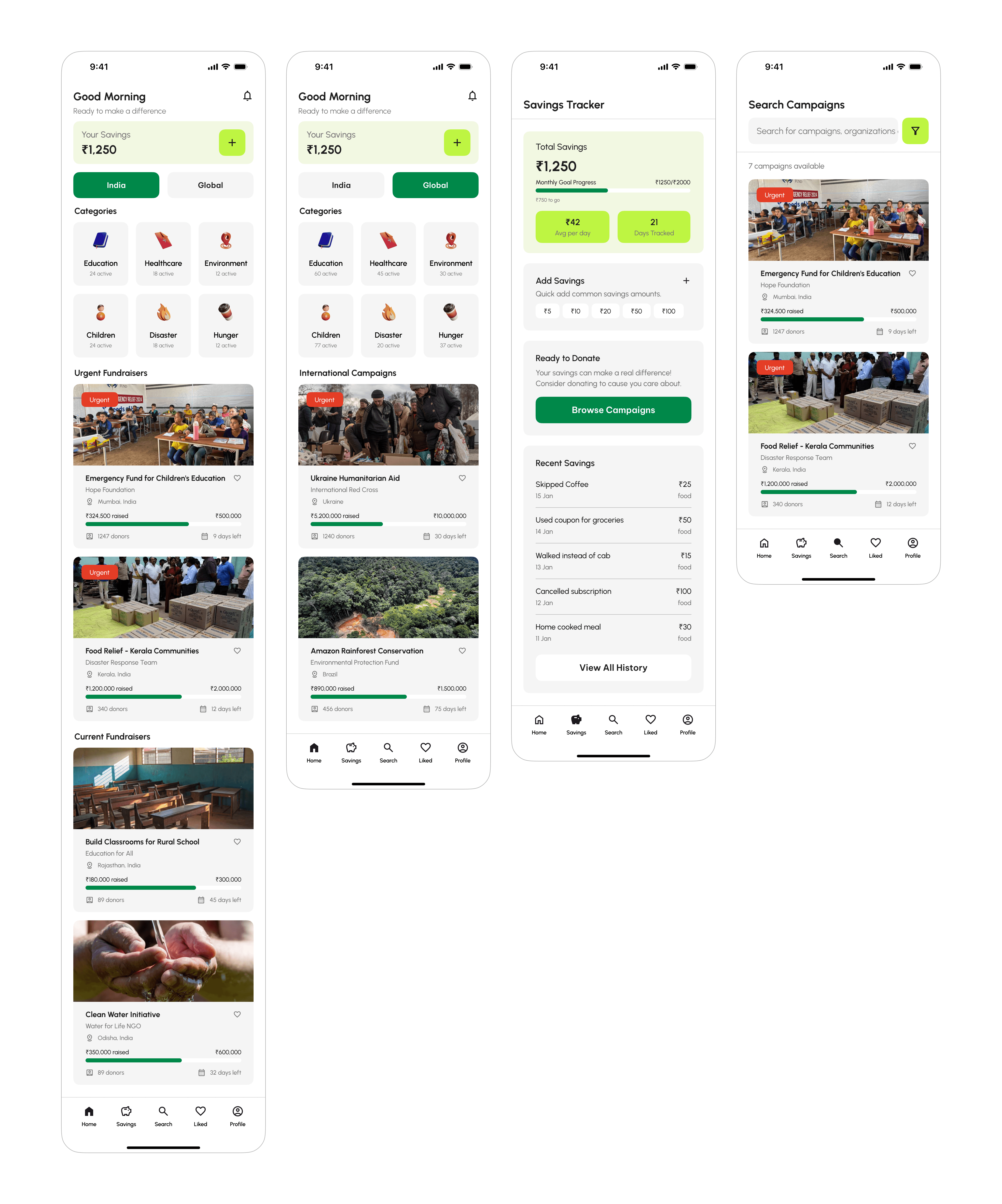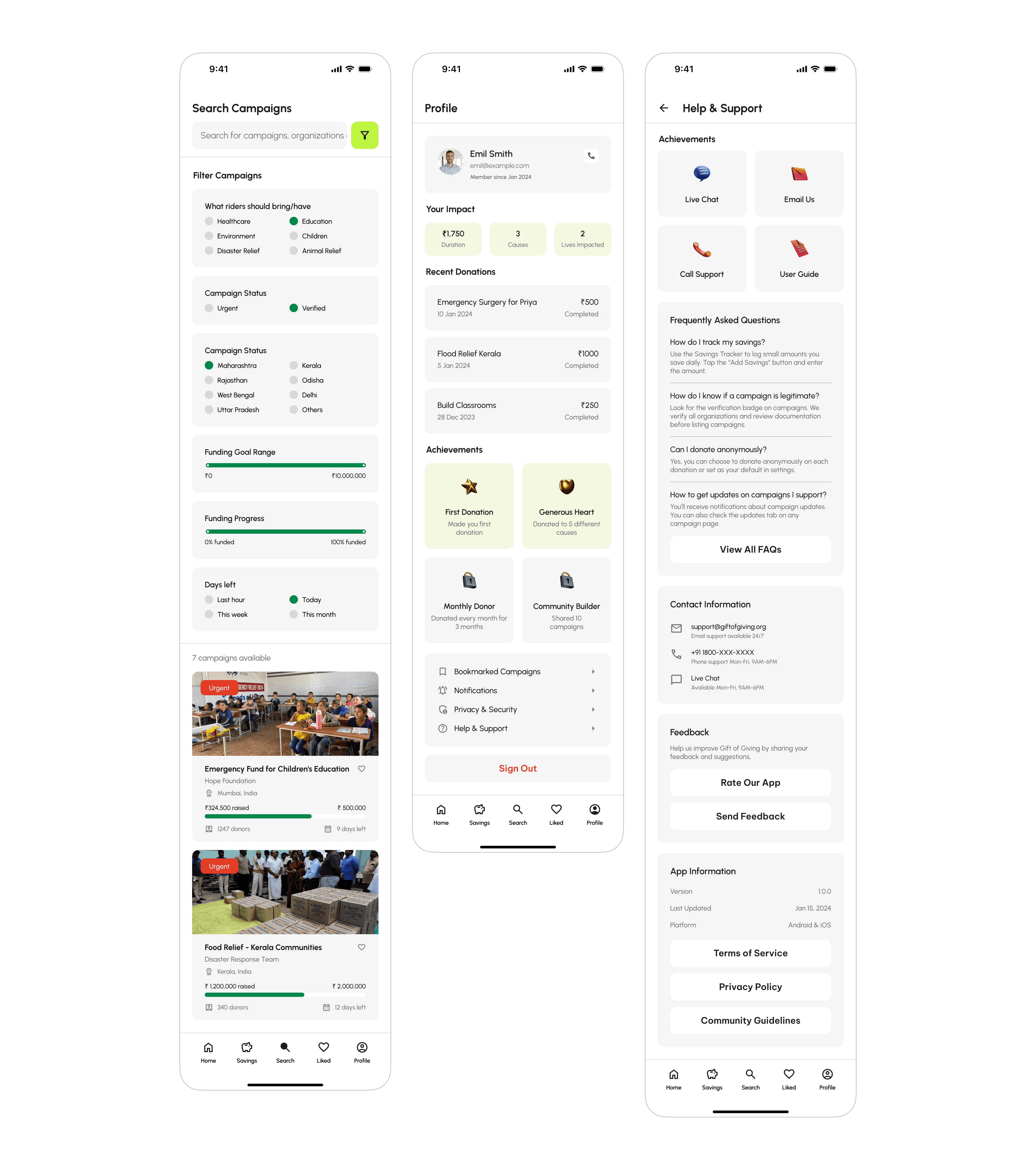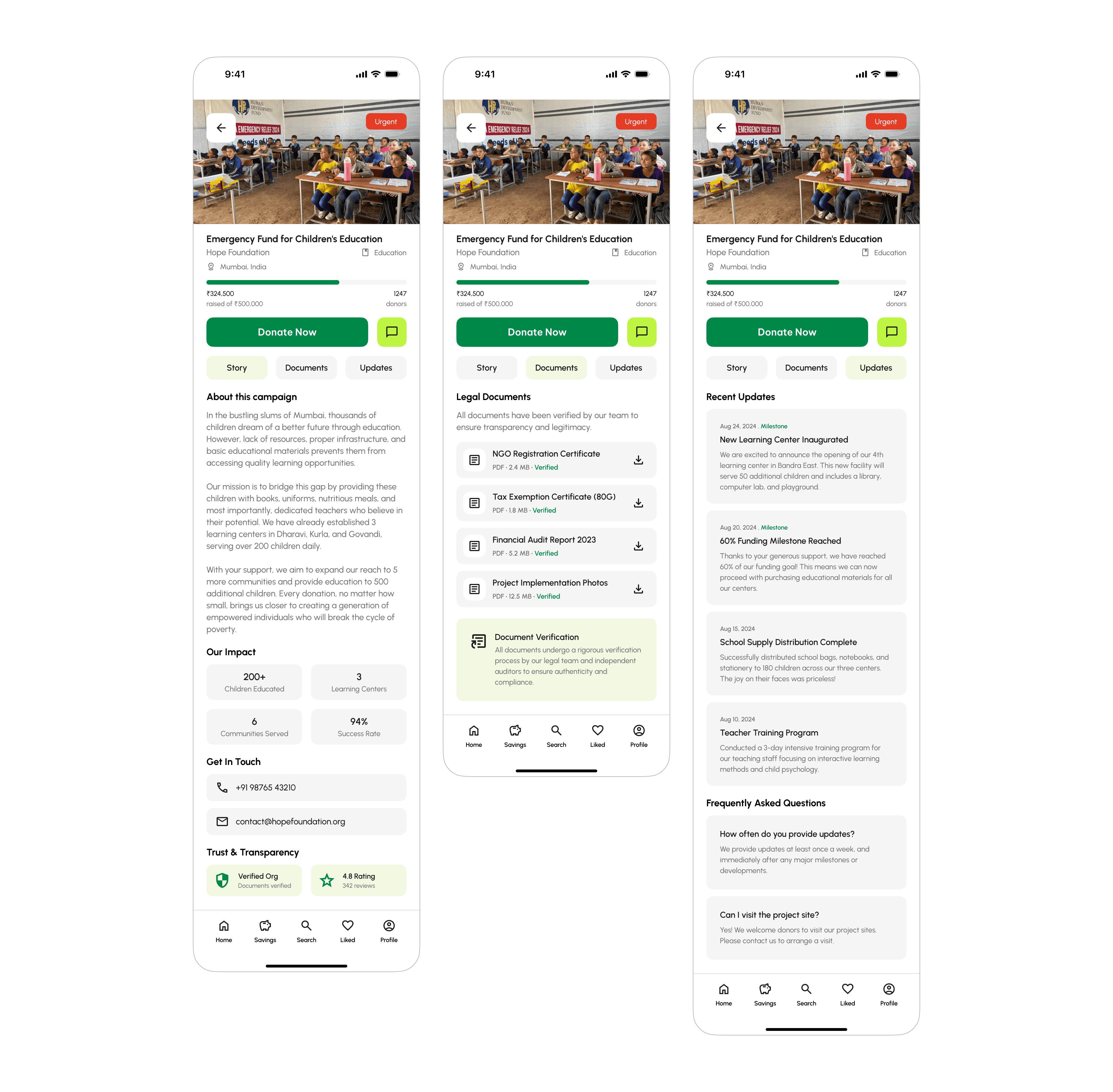 Transparency & Information: Both apps provide essential information, such as charity details, updates, and FAQs, but could improve interaction by incorporating real-time updates and more engaging, interactive reward systems.